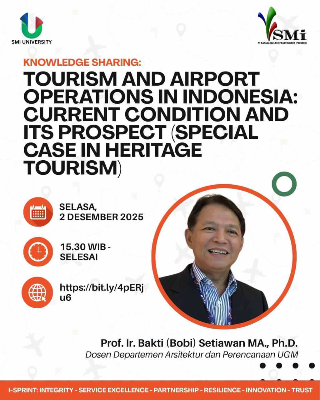 Prof. Ir. Bakti Setiawan M.A., Ph.D., yang akrab disapa Prof. Bobi, menjadi narasumber dalam acara Knowledge Sharing pada Selasa, 2 Desember 2025. Acara ini diselenggarakan oleh P.T. Sarana Multi Infrastruktur dan memberikan wawasan penting terkait perkembangan pariwisata dan operasional bandara di Indonesia. Prof. Bobi membawakan materi bertajuk “Tourism dan Airport Operations in Indonesia: Current Condition and Its Prospect (Special Case in Heritage Tourism)”.